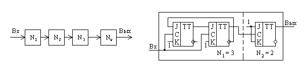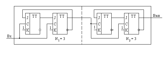 Рассмотрим еще пример: построим делитель с коэффициентом N = l0. Представим N = N1 . N2 = 5 . 2, при этом схема делителя строится в виде каскадного соединения делителей с коэффициентами Nl = 5 и N2 = 2, как показано на рис. 8.60.