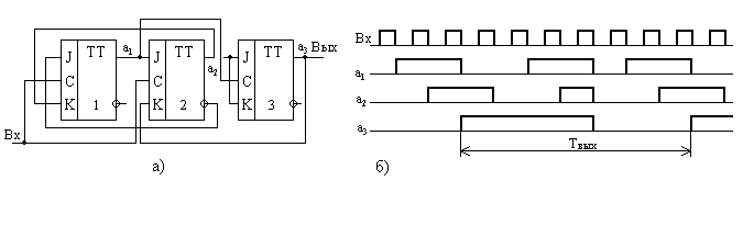 Делители частоты с коэффициентом деления N = 2n. На рис. 8.42,а показано последовательное соединение делителей частоты с коэффициентом деления, равным двум, при котором выход каждого из делителей подключен к входу следующего. На выходе каждого делителя частота следования импульсов вдвое ниже, чем на входе. Так, если частота следования импульсов на входе первого делителя fвх, то на выходе первого делителя она равна fвых1 = fвх/2, на выходе второго fвых2 = fвых1/2 = fвх/22, на выходе третьего делителя fвых3 = fвых2/2 = fвх/23 и т. д. При n каскадах подобного деления частота выходной последовательности окажется равной fвых = fвх/2n, т. е. будет осуществляться деление частоты в N = 2n раз.