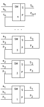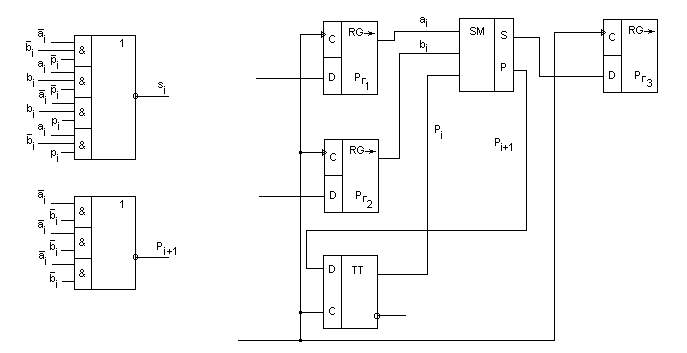 ). Операция суммирования во всех разрядах слагаемых осуществляется с помощью одного и того же одноразрядного сумматора. Такое построение сумматора возможно за счет того, что слагаемые поступают в последовательной форме.