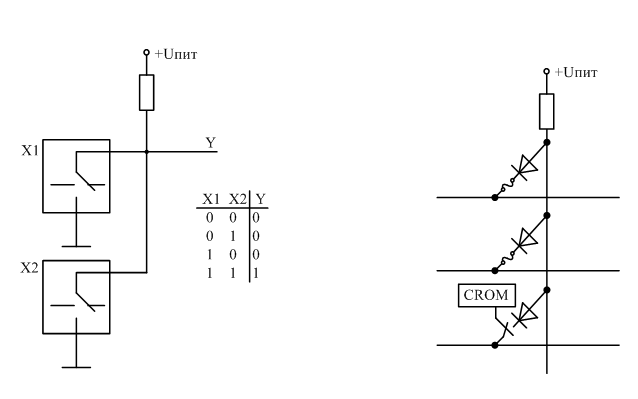 О правой части рисунка следует отметить использование диодов, которые предназначены для того, чтобы сигналы одной горизонтальной линии, подключенной к столбцу не влияли на сигнал другой горизонтальной линии. На данной части рисунка изображены как соединения на бае плавких перемычек, так и соединения на базе ключей. Это является примером – в реальных микросхемах такое невозможно.