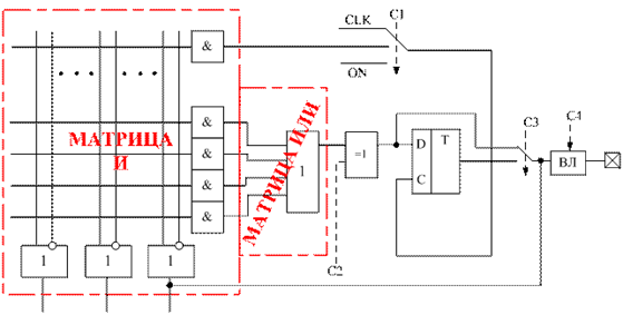 · D-триггер, запись в который осуществляется либо сигналом матрицы «И», либо внешним тактовым импульсом, либо постоянным уровнем.