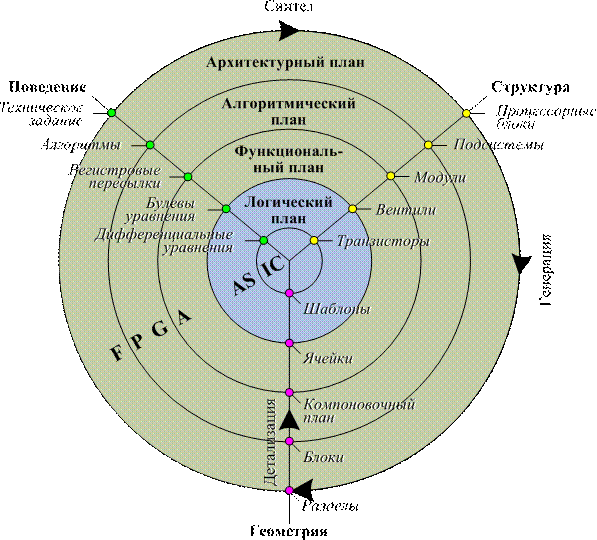 Геометрическая ветвь описывает внутреннюю геометрию интегральной схемы (расположение функциональных блоков, фотошаблоны)