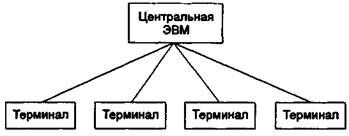 Принцип централизованной обработки данных (рис. 6.1) не отвечал высоким требованиям к надежности процесса обработки, затруднял развитие систем и не мог обеспечить необходимые временные параметры при диалоговой обработке данных в многопользовательском режиме. Кратковременный выход из строя центральной ЭВМ приводил к роковым последствиям для системы в целом, так как приходилось дублировать функции центральной ЭВМ, значительно увеличивая затраты на создание и эксплуатацию систем обработки данных.