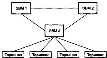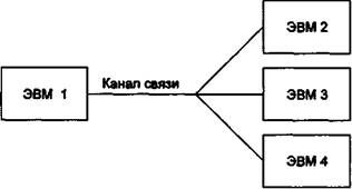 Пример 6.3. ЭВМ, осуществляющая сбор данных по некоторому региону, выполняет их предварительную обработку и передает для дальнейшего использования на центральную ЭВМ по телефонному каналу связи. Это дистанционный многомашинный комплекс.