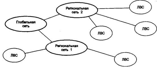 Объединение глобальных, региональных и локальных вычислительных сетей позволяет создавать многосетевые иерархии. Они обеспечивают мощные, экономически целесообразные средства обработки огромных информационных массивов и доступ к неограниченным информационным ресурсам. На рис. 6.4 приведена одна из возможных иерархий вычислительных сетей. Локальные вычислительные сети могут входить как компоненты в состав региональной сети, региональные сети — объединяться в составе глобальной сети и, наконец, глобальные сети могут также образовывать сложные структуры.