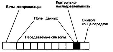 При синхронной передаче (рис. 6.8) информация передается блоками, которые обрамляются специальными управляющими символами. В состав блока включаются также специальные синхросимволы, обеспечивающие контроль состояния физической передающей среды, и символы, позволяющие обнаруживать ошибки при обмене информацией. В конце блока данных при синхронной передаче в канал связи выдается контрольная последовательность, сформированная по специальному алгоритму. По этому же алгоритму формируется контрольная последовательность при приеме информации из канала связи. Если обе последовательности совпадают — ошибок нет. Блок данных принят. Если же последовательности не совпадают — ошибка. Передача повторяется до положительного результата проверки. Если повторные передачи не дают положительного результата, то фиксируется состояние аварии.