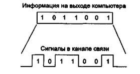 Чтобы обеспечить передачу информации из ЭВМ в коммуникационную среду, необходимо согласовать сигналы внутреннего интерфейса ЭВМ с параметрами сигналов, передаваемых по каналам связи. При этом должно быть выполнено как физическое согласование (форма, амплитуда и длительность сигнала), так и кодовое.