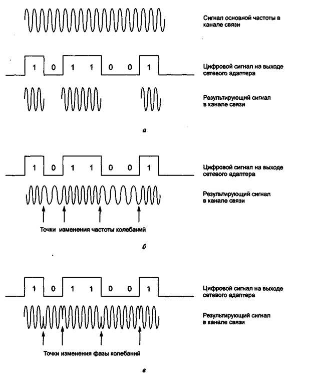 Частотная модуляция предусматривает передачу сигналов 0 и 1 на разной частоте. При переходе от 0 к 1 и от 1 к 0 происходит изменение сигнала несущей частоты (рис. 6. 11 б).