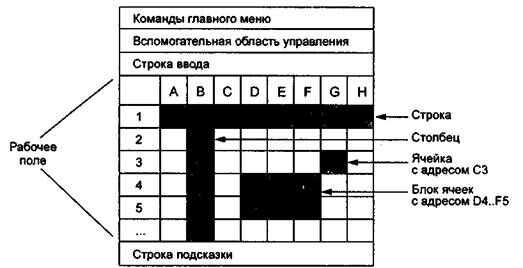 Как видно на рис. 14.1, при работе с электронной таблицей на экран выводятся рабочее поле таблицы и панель управления. Панель управления обычно включает: Главное меню, вспомогательную область управления, строку ввода и строку подсказки. Расположение этих областей на экране может быть произвольным и зависит от особенностей конкретного табличного процессора.