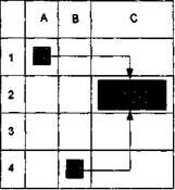 Пример 14.11. Клетка со ссылкой С2 содержит формулу-шаблон сложения двух чисел, находящихся в ячейках А1 и В4. Эти ссылки являются относительными и отражают ситуацию взаимного расположения исходных данных в ячейках А1 и В4 и результата вычисления по формуле в ячейке С2. По правилу относительной ориентации клеток ссылки исходных данных воспринимаются системой не сами по себе, а так, как они расположены относительно клетки С2: ссылка А1 указывает на клетку, которая смещена относительно клетки С2 на одну клетку вверх и на две клетки влево; ссылка В4 указывает на клетку, которая смещена относительно клетки С2 на две клетки вниз и одну клетку влево.