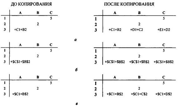 Рис. 14.2. Копирование формул: а — с относительными ссылками; б — с абсолютными ссылками; в — с частично абсолютными ссылками