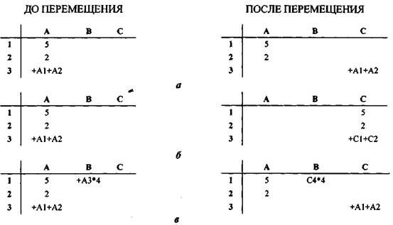 Рис. 14.3. Перемещение содержимого ячеек: а — одной ячейки; б — колонки; в — зависимых ячеек