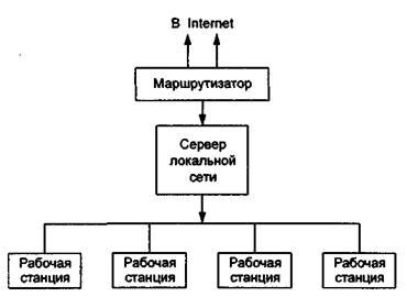 Для подключения локальных сетей к Internet используются средства, рассмотренные в подразд. 6.5. Схема подключения локальной сети к Internet приведена на рис. 6.25. Важной особенностью Internet является то, что она, объединяя различные сети, не создает при этом никакой иерархии — все компьютеры, подключенные к сети, равноправны. Для иллюстра­ции возможной структуры некоторого участка сети Internet приведена схема соединения различных сетей (рис. 6.26).