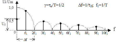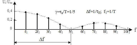Как видно из графика, в спектре сигнала преобладают низкочастотные составляющие. Нетрудно убедиться, что распределение средней мощности сигнала по его гармоникам является следующим: 50 %—постоянная составляющая, 40%— первая гармоника, 5 % — третья гармоника, 1 % - пятая гармоника. и т.д. Таким образом, в диапазоне частот (0 … 2f1) содержится 90% средней мощности импульсного сигнала, в полосе частот (0 … 4f1) — 95 % мощности сигнала.