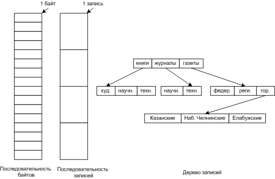 - Последовательность записей - записей фиксированной длины (например, перфокарта), считываются последовательно. Сейчас не используются.