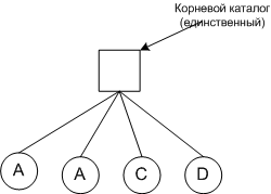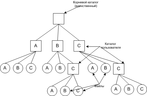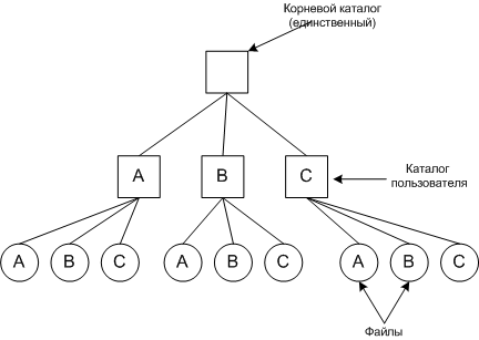Однокаталоговая система, содержащая четыре файла, файлов А два, но разных владельцев