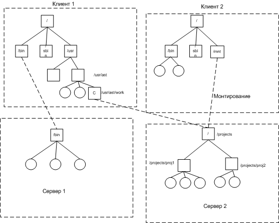- Ядро формирует r-узел (удаленный i-узел) для удаленного каталога в своих внутренних таблицах. В результате v-узел указывает либо на r-узел для удаленного каталога, либо на i-узел одной из локальных файловых систем.