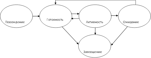 Допустимые состояния процесса и переходы между ними удобно изображать в виде графа существования процесса (рис. 1).