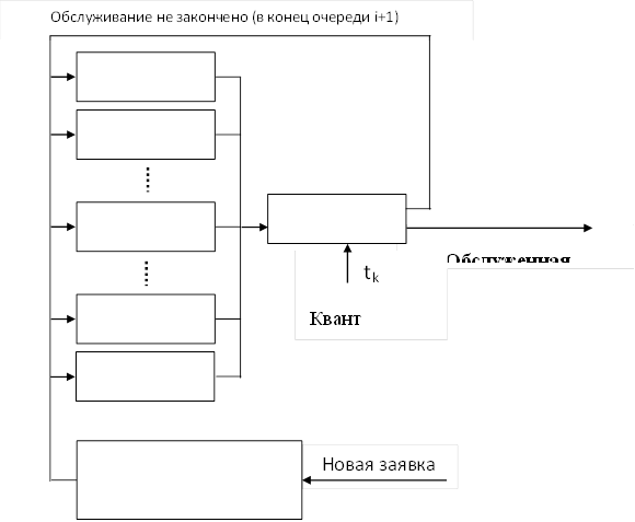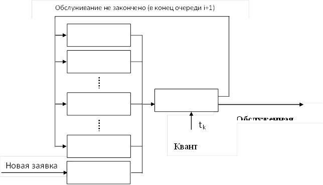 Эта дисциплина используется, в частности, при реализации режима разделения времени. В ее основе лежит дисциплина FIFO. Квант времени обслуживания tk (квант мультиплексирования) ограничивает длительность обслуживания процесса. Если заявка не успевает обслужиться за время tk , то ее обслуживание прерывается, и она поступает в конец очереди. Здесь имеет место «дискриминация» – в наиболее благоприятных условиях оказываются короткие заявки, они имеют меньшие времена ожидания. Степень благоприятствования коротким заявкам тем больше, чем меньше длительность кванта мультиплексирования. Однако уменьшение tk ведет к увеличению накладных расходов, необходимых для обработки прерываний и перераспределения ресурса.
