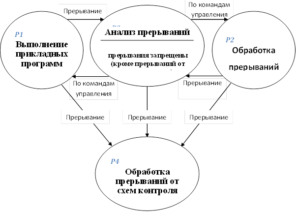 Рис. 7. Характер переходов процессора между допустимыми состояниями, обусловленных возникновением и обработкой прерываний