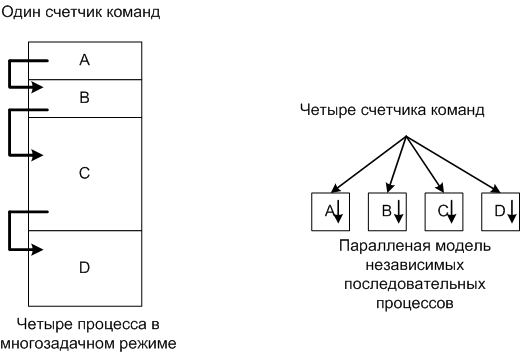 С права представлены параллельно работающие процессы, каждый со своим счетчиком команд. Разумеется, на самом деле существует только один физический счетчик команд, в который загружается логический счетчик команд текущего процесса. Когда время, отведенное текущему процессу, заканчивается, физический счетчик команд сохраняется в памяти, в логическом счетчике команд процесса.