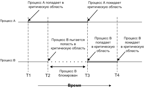 - Противоречит третьему условию, когда процесс, находящийся вне критической области, может блокировать другие процессы.