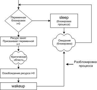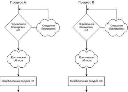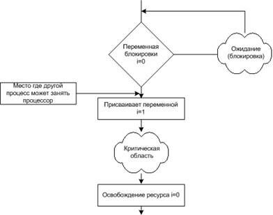 Вводится понятие переменной блокировки, т.е. если значение этой переменной равно, например 1, то ресурс занят другим процессом, и второй процесс переходит в режим ожидания (блокируется) до тех пор, пока переменная не примет значение 0.