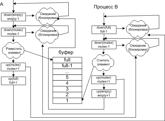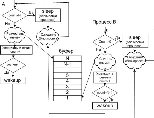 - Процесс А в конце концов заполнит буфер и заблокируется, но сигнала на разблокировку не получит.