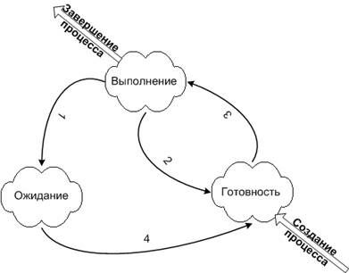 - Готовность (процесс временно приостановлен, чтобы позволить выполняться другому процессу)
