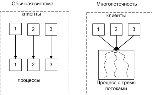 Каждому процессу соответствует адресное пространство и одиночный поток исполняемых команд. В многопользовательских системах, при каждом обращении к одному и тому же сервису, приходится создавать новый процесс для обслуживания клиента. Это менее выгодно, чем создать квазипараллельный поток внутри этого процесса с одним адресным пространством.