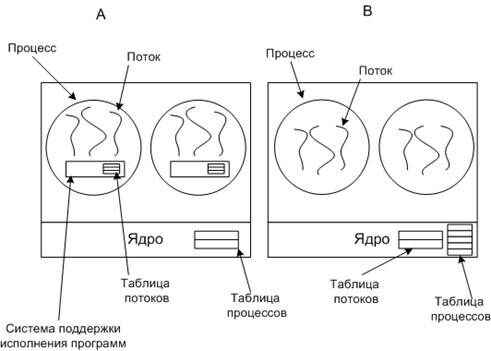 В случае А ядро о потоках ничего не знает. Каждому процессу необходима таблица потоков, аналогичная таблице процессов.