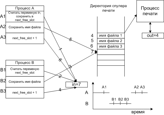 Рассмотрим пример, когда два процесса пытаются распечатать файл. Для этого им нужно поместить имя файла в спулер печати, в свободный сегмент.