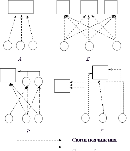 Наиболее простым типом является линейная организационная структура. В этом случае все вертикальные связи имеют форму дерева (Рис.9.2 А).
