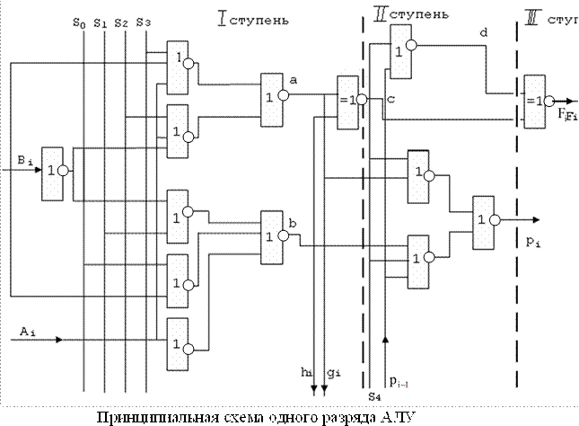 в предыдущих разрядах в соответствии (7). Такая организация сигнала переноса обеспечивает лучшее быстродействие, но требует аппаратных затрат при большом числе разрядов АЛУ.
