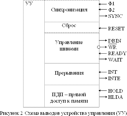 МП имеет 40 выводов. Каждая линия управления имеет свое функциональное назначение.