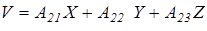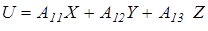 При отображении геометрического объекта в аксонометрической проекции реальные мировые координаты точек объекта отображаются в двухмерные координаты принятой аксонометрической модели. В общем случае любая аксонометрическая проекция может быть представлена как вырожденное афинное преобразование геометрического объекта, переводящее пространственный объект в плоскую фигуру. Квадратная матрица такого преобразования переводит вектор мировых координат произвольной точки объекта в вектор координат плоскости аксонометрической проекции. Обозначая компоненты преобразованного вектора как U - горизонтальная координата плоской аксонометрической модели, а V - вертикальная координата , для каждого вида проекций можно получить линейное преобразование вида: