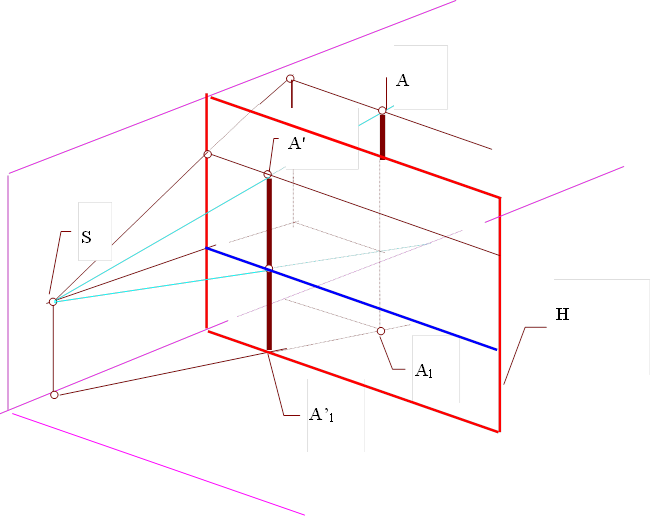 Для перехода от двухкартинного комплексного чертежа к перспективному изображению используется метод проективных пучков. Чтобы построить перспективу точки A(A1,A2) необходимо: