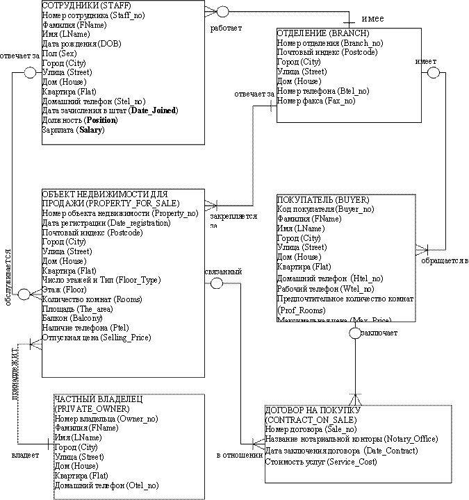 Если клиент согласен купить некоторый объект, то он заключает с компанией договор на покупку. Сотрудник компании должен оформить это соглашение. Каждый объект может быть продан единственному клиенту, и каждый клиент может купить один или более объектов в одно и то же время. Образуется необязательная с двух сторон связь 1:М между сущностями Покупатель и Объект недвижимости для продажи. Но так как, всякий раз, при покупке клиент заключает договор с компанией, мы определим две связи. Связь 1:М между сущностями Покупатель и Договор на покупку, а также связь 1:М между сущностями Объект недвижимости для продажи и Договор на покупку. Связи обязательны со стороны сущности Договор на покупку. Ключевым атрибутом для сущности Покупатель является Код покупателя (Buyer_no), а для сущности Договор на покупку – атрибут Номер договора (Sale_no). Кроме этого сущность Договор на покупку (CONTRACT_ON_SALE) имеет атрибуты: название нотариальной конторы, дата заключения договора, стоимость услуг. Инфологическая модель данных приведена на рисунке 7.