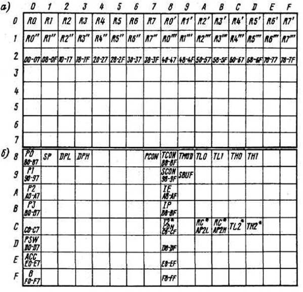 Набор программно-доступных регистров процессора ВЕ51 приведен на рисунке 54. Он является расширением набора регистров ВЕ48, что обеспечивает совместимость архитектур ВЕ48 и ВЕ51 снизу вверх. Центральным регистром набора считается 8-разрядный аккумулятор А, выполняющий обычные функции основного арифметического регистра.