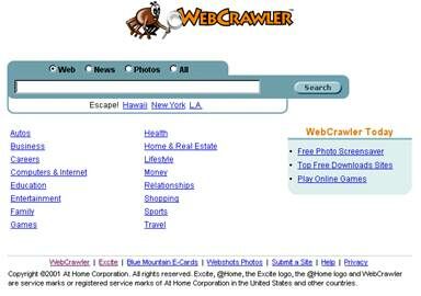 6. WebCrawler. Открыта 20 апреля 1994 года как проект Вашингтонского Университета. WebCrawler предоставляет возможности синтаксиса для конкретизации запросов, а также большой выбор аннотаций узлов при несложном интерфейсе.