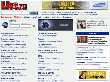 3. List.ru (http://www.list.ru) По своей реализации этот сервер имеет много общего с англоязычной системой Yahoo!. На главной странице сервера расположены ссылки на наиболее популярные поисковые категории.