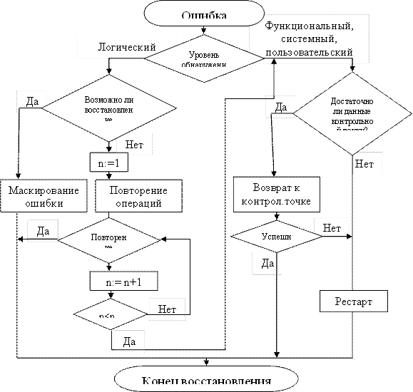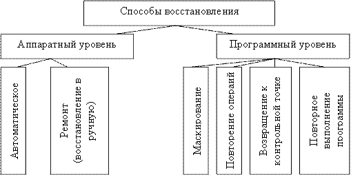 Средства восстановления включаются в работу при обнаружении ошибки системой контроля. Способ восстановления зависит от уровня, на котором обнаружена ошибка. В зависимости от нарушений в работе системы можно выделить следующие способы восстановления: маскирование, повторение операции, возврат к контрольной точке, программный рестарт. На рис. 2 приведен алгоритм автоматического восстановления вычислительного процесса после сбоев, где использованы  все виды восстановления.