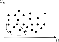 Каждый вариант этом графике представляется точкой. Из всех вариантов заданной стоимости С интерес представляют только варианты, обладающие минимальной вероятностью отказа Q. Из вариантов при заданной (ими меньшей) вероятности отказа Q интересны только варианты, отличающиеся минимальной стоимостью С. Отсюда следуют, что из всего множества вариантов интерес представляют только те, которые находятся снизу и слева.
