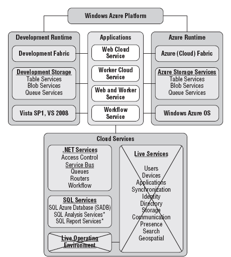 Платформа Windows Azure – это модель Платформа как Сервис, которая предполагает запуск приложений на серверах и связанной сетевой инфраструктуре, размещенной в центрах обработки данных Microsoft и имеющей доступ в Интернет. Платформа состоит из мастшабируемой «облачной» операционной системы, фабрики хранения данных и связанных сервисов доставки через физические или логические (виртуализация) экземпляры Windows Server 2008. Комплект средств разработки Windows Azure (SDK) обеспечивает разработку версии «облачных сервисов», также хорошо, как инструменты и интерфейсы прикладного программирования (API), необходимые для разработки, разворачивания и управления масштабируемых сервисов в Windows Azure, включая шаблоны приложений Azure для Visual Studio 2008 и 2010. На рисунке 6-1 изображены компоненты основа «облачной» платформы и компоненты разработчика.