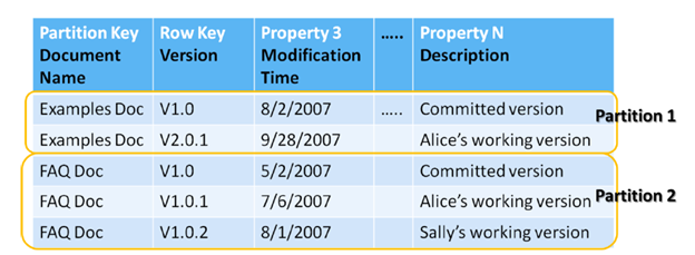На рисунке выше представлена таблица, содержащая множество версий документов. Каждая сущность данной таблицы соответствует определенной версии определенного документа. В этом примере ключом секции таблицы является имя документа, и ключом строки – номер версии. Имя документа и версия уникально идентифицируют каждую сущность таблицы. В данном примере секцию образуют все версии одного документа.