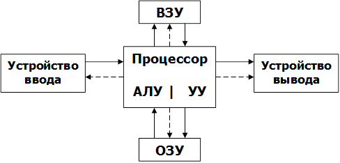 Основными блоками по Нейману являются устройства управления (УУ), арифметико-логическое устройство (АЛУ), оперативная память, внешняя память, устройства ввода и вывода. ВЗУ – внешнее запоминающее устройство отличается от других устройств вводавывода тем, что данные в него заносятся в виде, удобном компьютеру, но недоступном для непосредственного восприятия человеком. Так, накопитель на магнитных дисках относится к внешней памяти, а клавиатура – устройство ввода, дисплей и печать – устройства вывода.