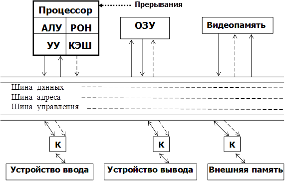 Исторически компьютер появился как машина для вычислений и назывался электронной вычислительной машиной – ЭВМ. Структура такого устройства была описана знаменитым математиком Джоном фон Нейманом в 1945 г. Фон Нейман выдвинул основополагающие прин-ципы логического устройства ЭВМ и предложил ее структуру, которая воспроизводилась в течение первых двух поколений ЭВМ. На рис. 2.2 пунктирными линиями обозначены цепи сигналов управления (управляющие связи), одинарными – цепи передачи данных и адресов (информационные связи).