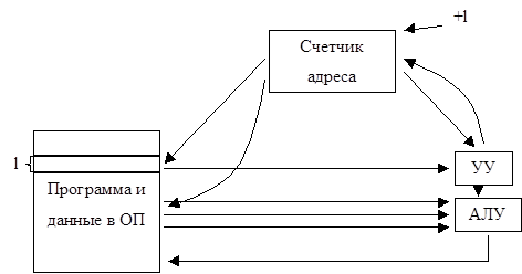 (УУ) считывает адрес очередной подлежащей исполнению команды из СчА, обращается по этому адресу и считывает указанный байт, который интерпретируется как код операции, который определяет формат (структуру) команды. Знание кода операции и формата команды позволяет УУ определить, какую же команду надо выполнить, над какими операндами и куда поместить результат операции. Формат команды определяет, сколько операндов у данной операции, где они расположены (в памяти, в регистрах, непосредственно в команде), как должно быть интерпретировано содержимое соответствующих областей памяти, т.е. какого они типа. Вся эта информация передается Арифметико-Логическому Устройству (АЛУ), которое и отрабатывает данную команду. Формат команды также определяет ее длину, и после выборки текущей команды УУ наращивает СчА на ее длину так, что по завершении выполнения текущей команды в СчА находится уже адрес очередной команды (если это не была команда перехода). Таким образом, в последовательных ЭВМ реализуется так называемая нить управления (thread), или же поток команд, обрабатывающих поток данных (операндов), определяемых этими командами.