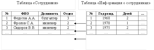 · один-к-одному (1:1) – каждому кортежу одного отношения соответствует только один кортеж другого отношения (рисунок 5.1);