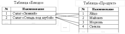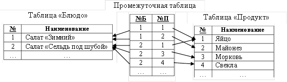 Значения промежуточной таблицы наглядно показывают, какое блюдо использует какой продукт.